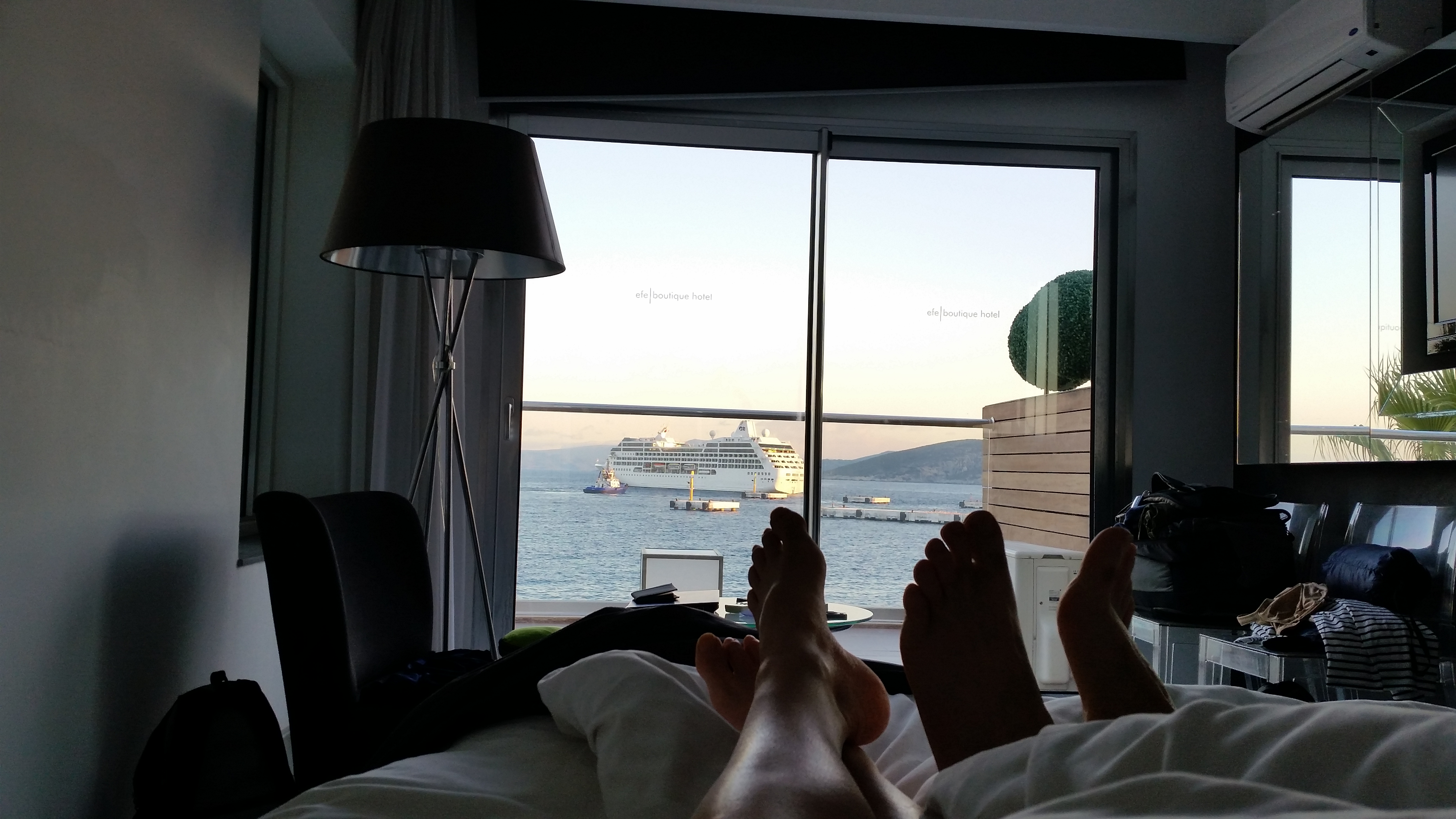 That evening, we were deposited onto a train platform (I’m not joking – our minibus drove RIGHT ONTO the platform where the people were standing) for the train to Ephesus. After a day of touring Capadoccia followed by a night bus, a day of touring Pamukkale, and another five hours on a train, we finally arrived at a fancy, shmancy boutique hotel with a good shower, an actual bathtub (the first one we’d seen in Europe), and a glorious view of the sea.