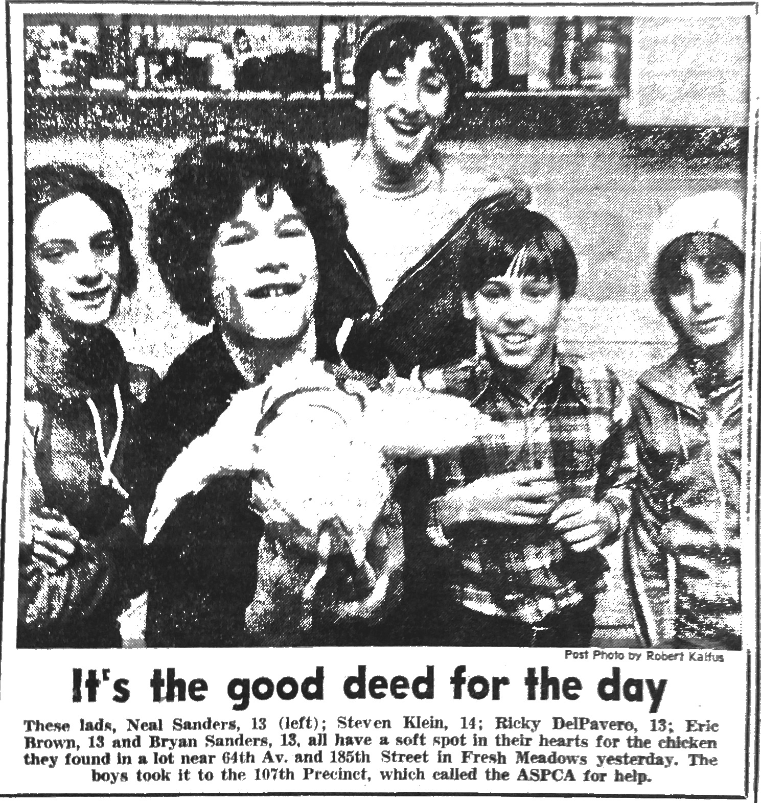 (The sidebar to this story is that the chicken spent the winter in our garage in Queens. We neglected to tell the photographer that we were looking for a good home for the poor creature, and he added a line of total hooey to the caption about how we took the chicken to the police, who called the ASPCA. The New York Post, by that time, had abandoned all journalistic tendencies. They’ve gone downhill since then.)